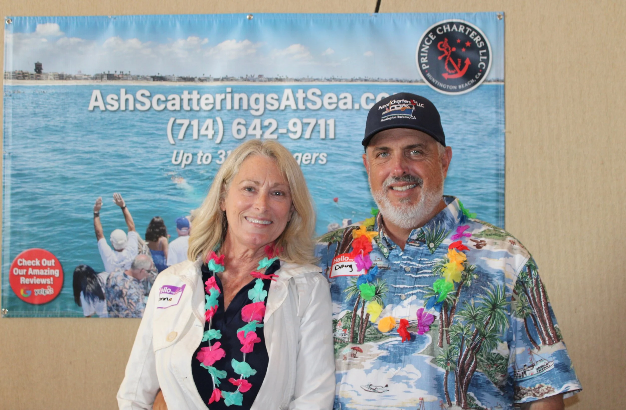 Captain Tony Miller with LACFDA Vendor Partner Donna Misterly, both from Prince Charters/AshScatteringsAtSea.com